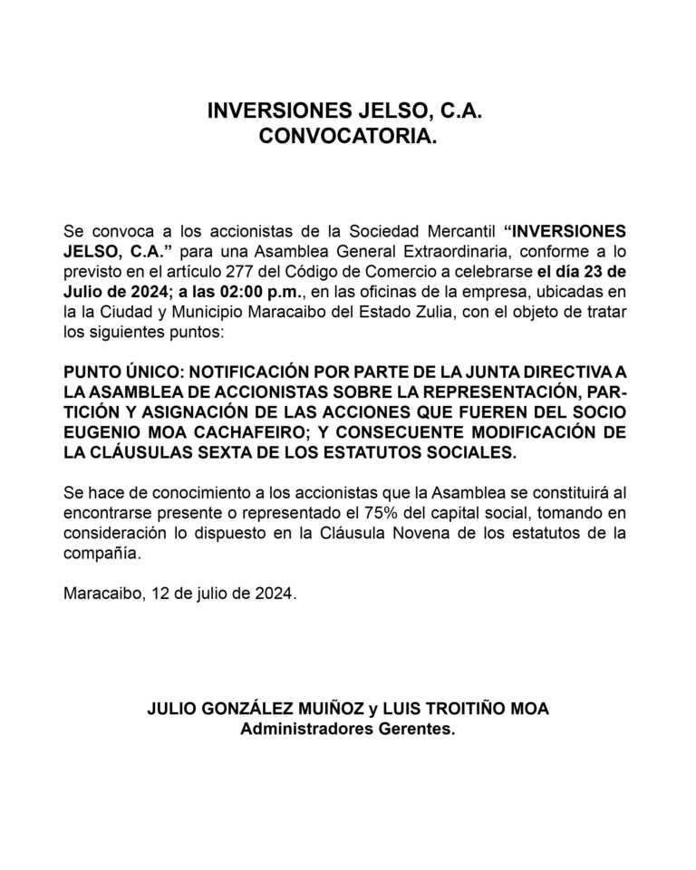 Convocatoria Inversiones Jelso, C.A