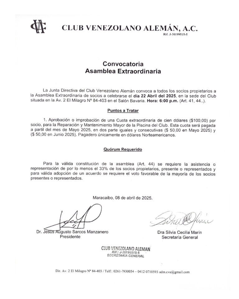 Convocatoria Asamblea Extraordinaria Club Venezolano Alemán