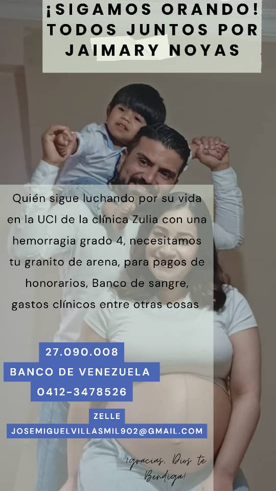 Jaimary está en la Unidad de Cuidados Intensivos (UCI) de la Clínica Zulia, sede Sabaneta, y requiere de al menos 15 donantes de sangre de cualquier tipo. Quienes deseen colaborar, deben ir a las 8.00 de la mañana a dicho recinto de salud.
