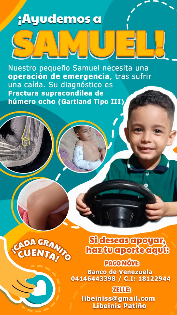 Samuel Mata, marabino de 4 años, sufrió una caída el pasado lunes 10 de noviembre que le ocasionó una fractura en su brazo derecho, por lo que que necesita ser operado de emergencia, pero el procedimiento es costoso y su familia no puede cubrir.lo