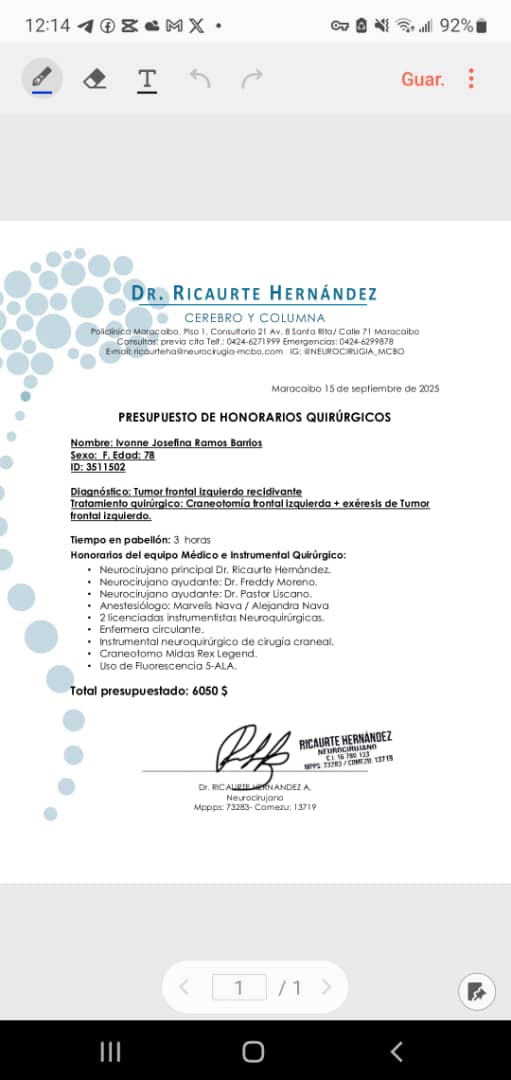 La familia de Ivonne Josefina Ramos, de 78 años, busca ayuda para salvarle la vida a esta abuela marabina, quien fue diagnosticada con un tumor frontal izquierdo recidivante, por lo que necesita ser intervenida quirúrgicamente de emergencia.