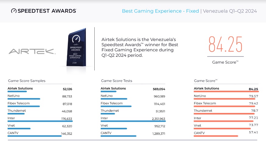 Junto al de red fija más rápida, Airtek también ha ganado el Premio a la Mejor Experiencia de Videojuegos en red fija en Venezuela.