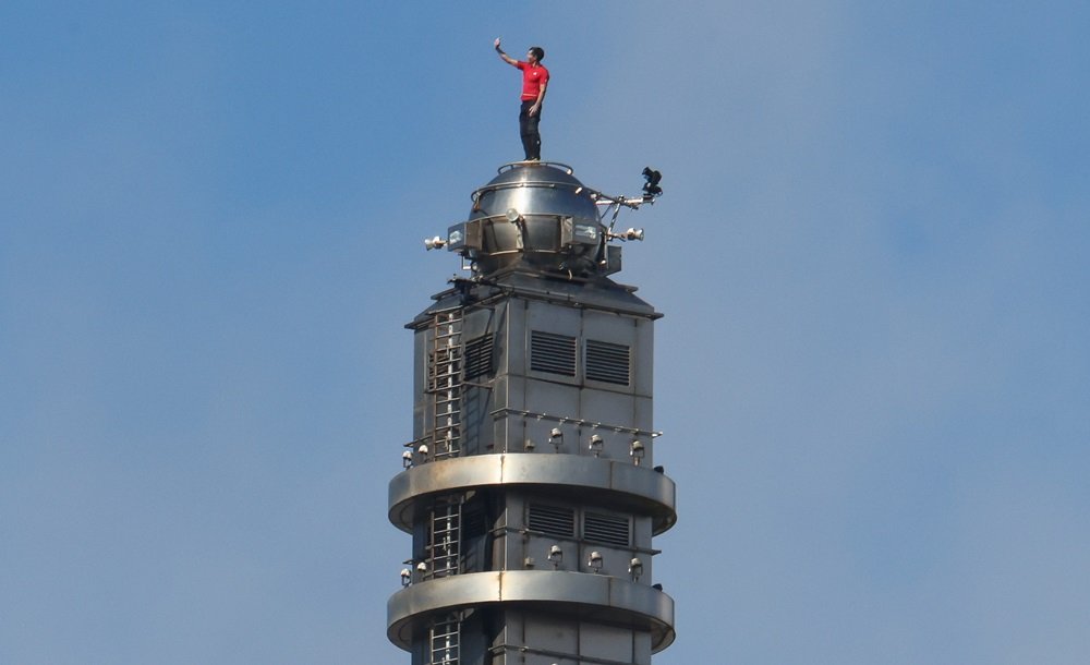 Su ascenso incluyó tramos complejos del diseño arquitectónico, como la base inclinada de acero y vidrio, las estructuras metálicas conocidas como ruyi y el largo segmento central formado por las llamadas “cajas de bambú”, que cubren más de 270 metros verticales.