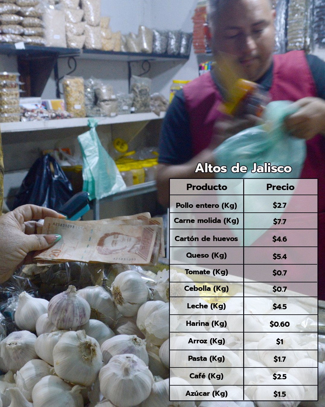 Respecto a víveres, la leche en polvo cuesta $5, la harina de maíz precocida $1.4, el arroz $1.4, la pasta $1.6, el café $3.3 y el azúcar $1.5.