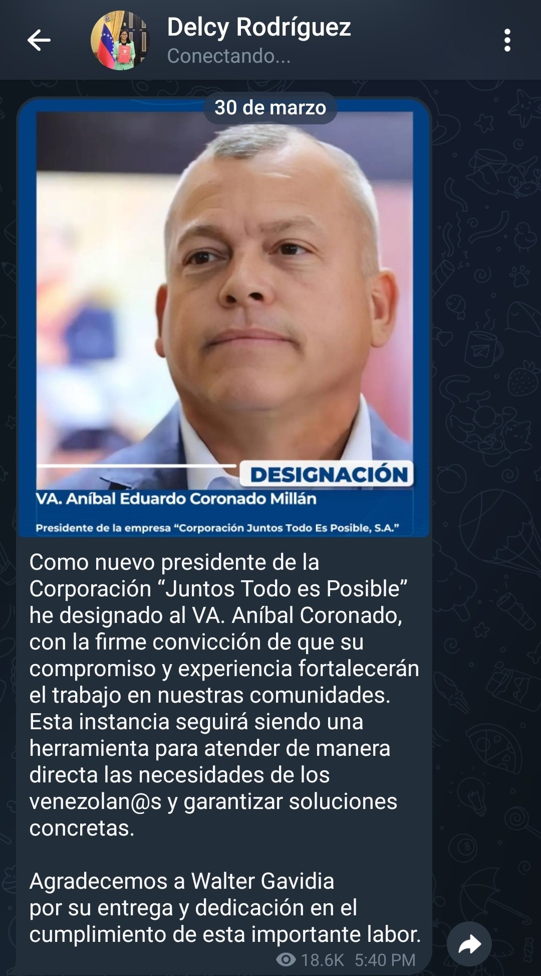 Delcy Rodríguez nombró al vicealmirante Aníbal Coronado como nuevo presidente de la Corporación Nacional Juntos Todo es Posible. Quien hasta hace pocos días se desempeñaba como ministro de Transporte y anteriormente como jefe del Despacho de la Presidencia, asume la dirección de esta instancia dedicada a la ejecución de obras y atención comunitaria.