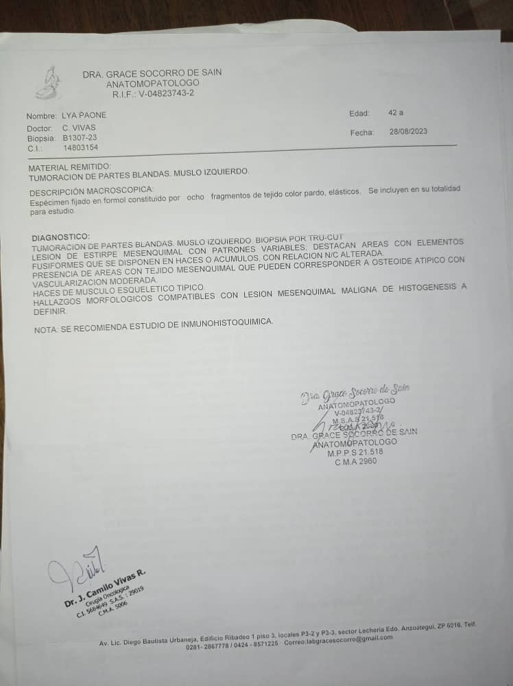A Lya Paone Sanzonetti, de 43 años, quien reside en Anaco, le diagnosticaron sarcoma de partes blandas en su pierna izquierda