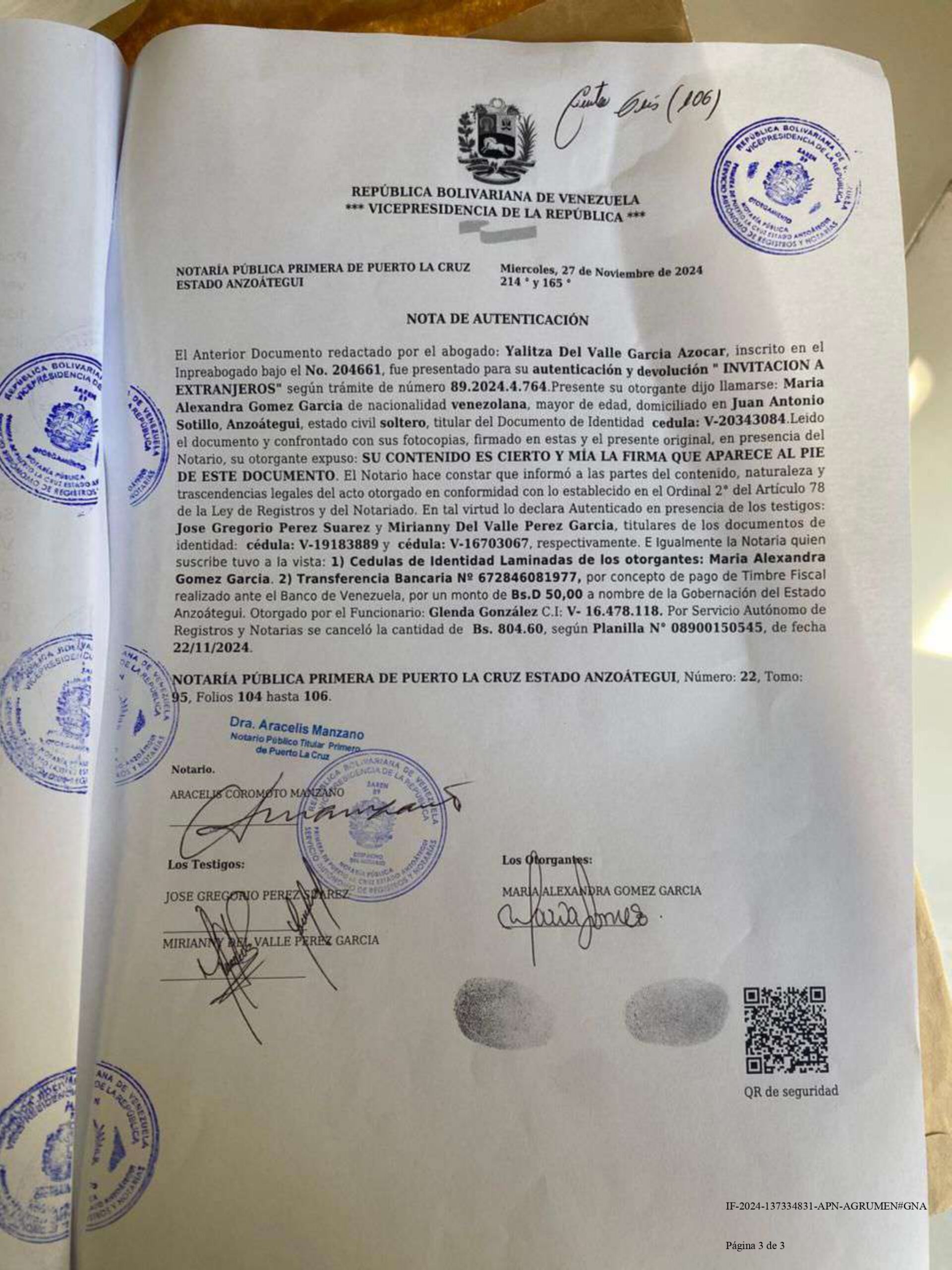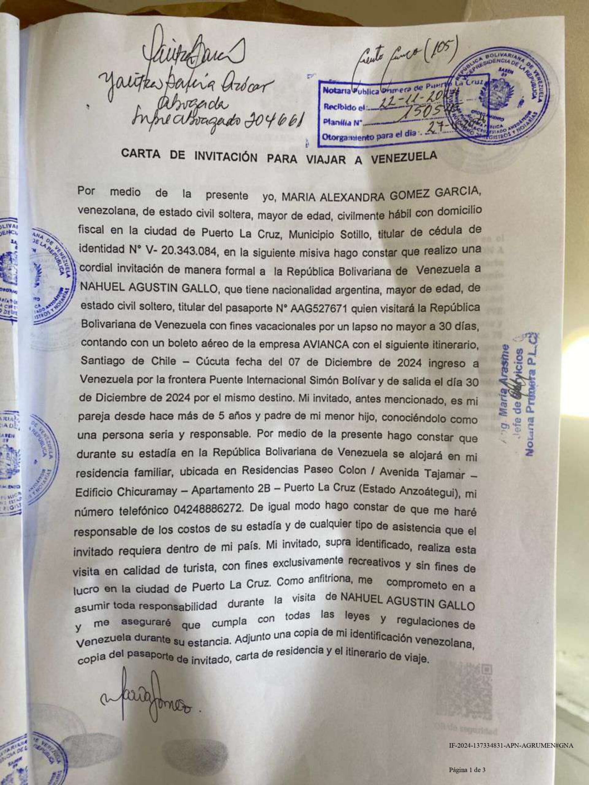 El 22 de noviembre de 2024, María Gómez García, la pareja de Gallo, con quien tuvo en Buenos Aires un hijo que hoy tiene 11 meses y vive en Venezuela, presentó una “Carta de invitación para viajar a Venezuela”, el documento que exige la administración oficialista para que los extranjeros puedan visitar el país sin problemas y con un registro oficial que avale ese viaje, en el que consta la persona que va a visitar y también el domicilio en donde piensa residir. Los argentinos no necesitan visa para viajar por motivos de turismo.