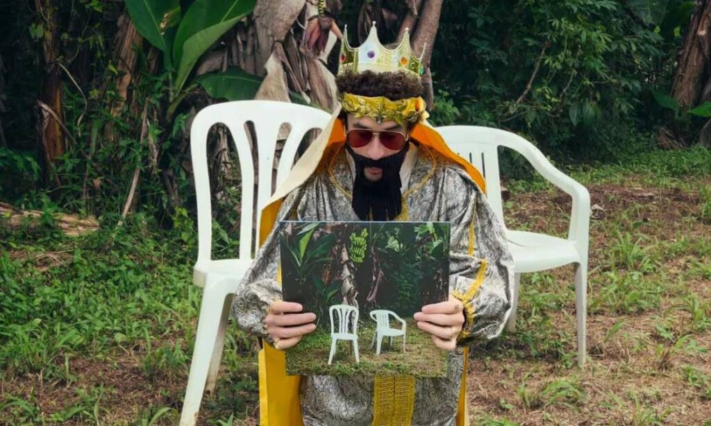 Vestido como uno de los Reyes Magos, el cantante saca su nuevo álbum de un paquete y agrega: "Ya llegaron los Reyes".