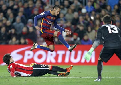 El brasileño Neymar volvió a cuajar un partido excelso con el Barcelona, al que condujo a la victoria en la goleada 6 por 0 al Athletic Club, que tuvo también a Luis Suárez como otro protagonista destacado.