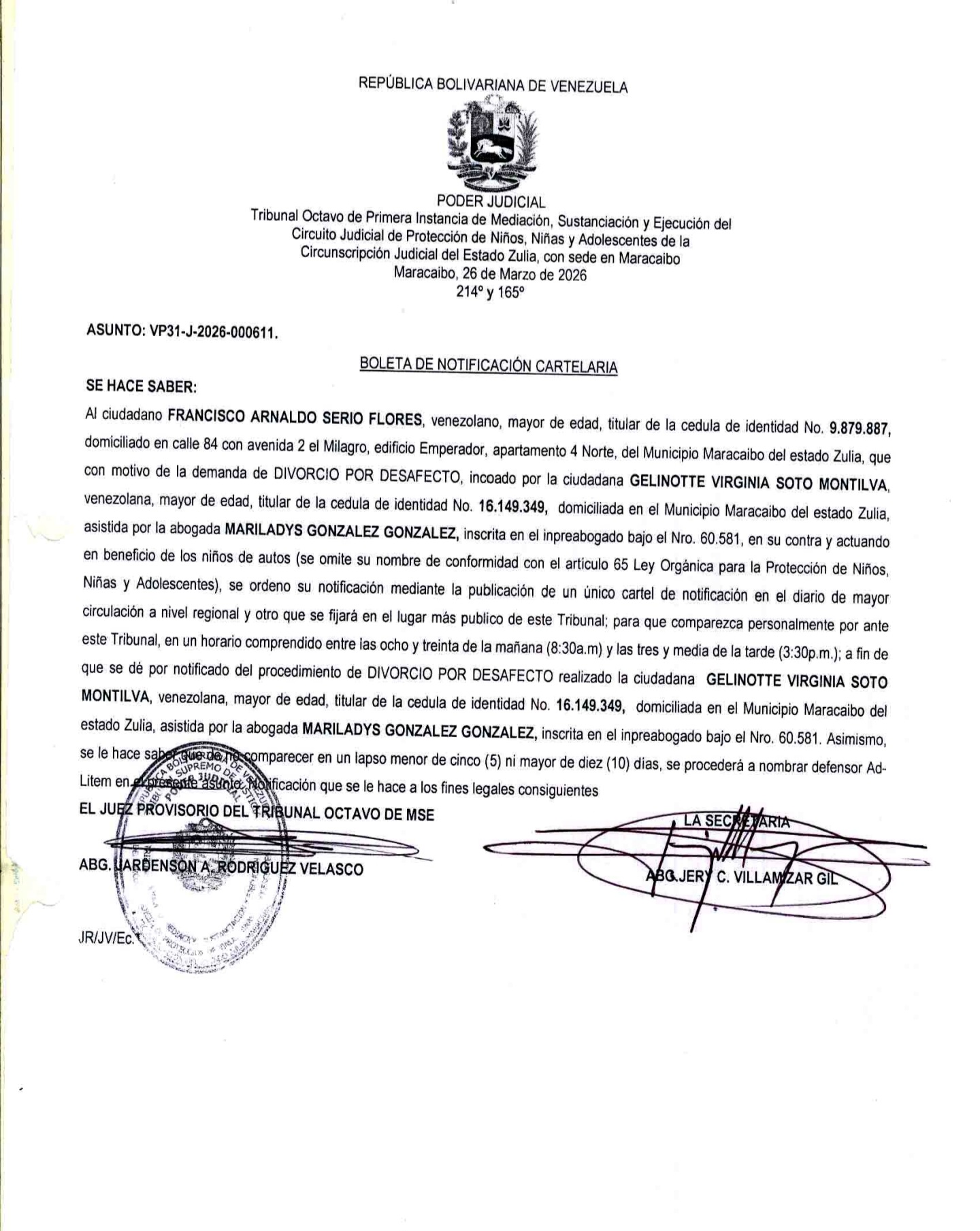 Boleta de Notificación Cartelaria Asunto VP31-2026-000611