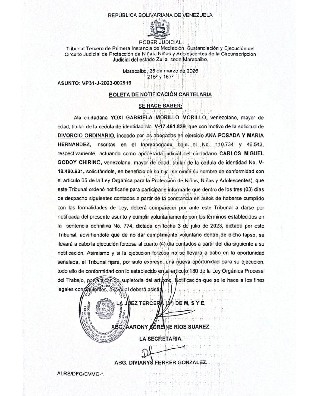 Boleta de Notificación Cartelaria Asunto VP31-J-2023-002916