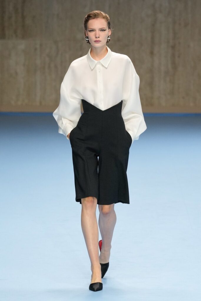 Las piezas vaporosas de colores fucsias, verdes o azules celeste contrastaban con otras piezas más austeras, como “blazers”, trajes y capas en tonos grises y raya diplomática, o aquellas que se limitaban al sofisticado blanco y negro.