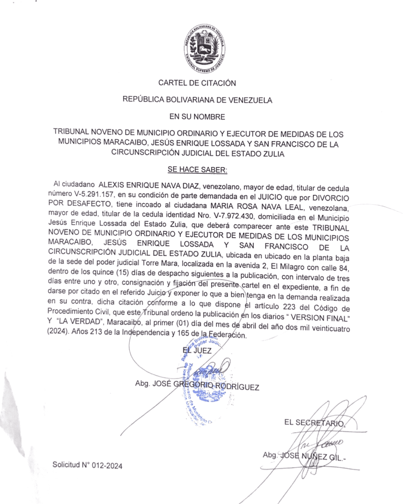 Cartel de citación Solicitud Nro. 012-2024