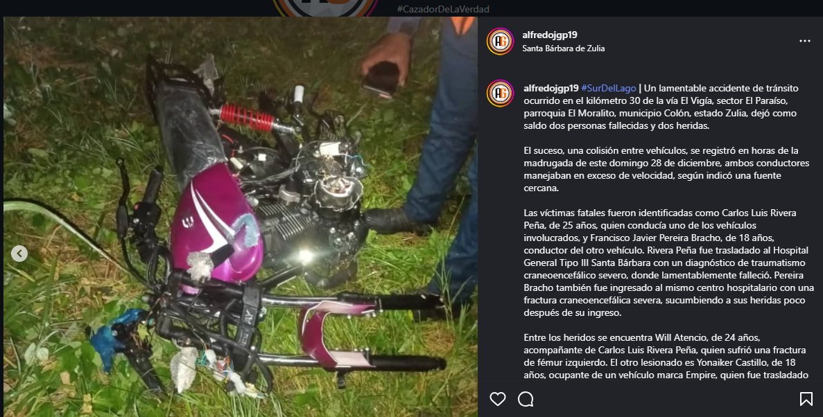 Dos motorizados colisionaron la madrugada de este domingo 28 de diciembre en el kilómetro 30 de la vía El Vigía, sector El Paraíso, municipio Colón, en el Sur del Lago de Maracaibo, estado Zulia. El hecho dejó dos personas muertas y dos heridas.