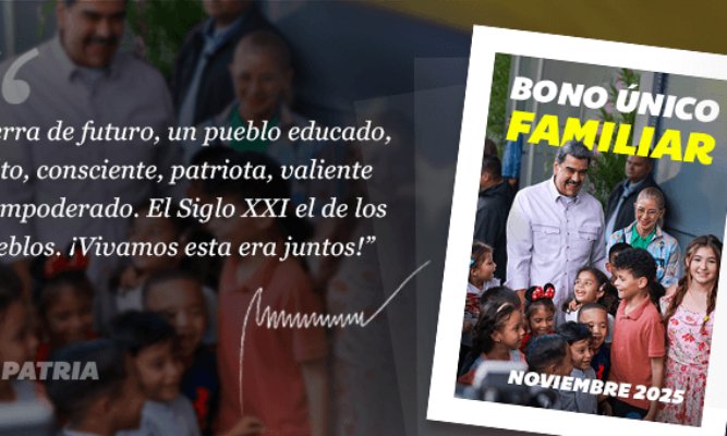 El gobierno de Nicolás Maduro inició este lunes 3 de noviembre la entrega del Bono Único Familiar correspondiente al mes en curso, a través del Sistema Patria.