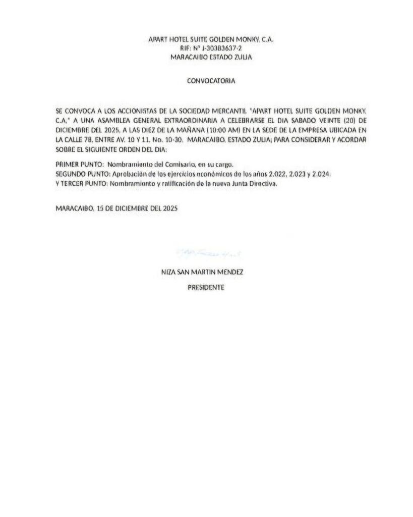 Convocatoria Asamblea Extraordinaria de Accionistas Apart Hotel Suite Golden Monky, C.A