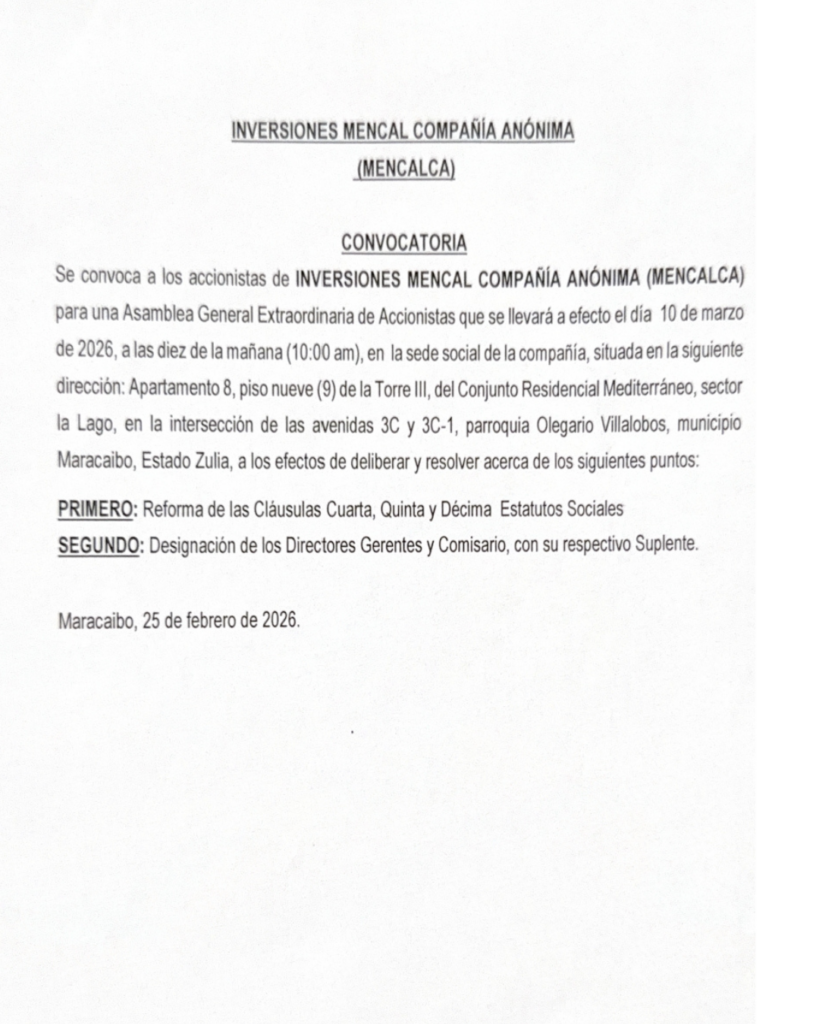 Convocatoria Asamblea Extraordinaria de Accionistas Inversiones Mencal, CA