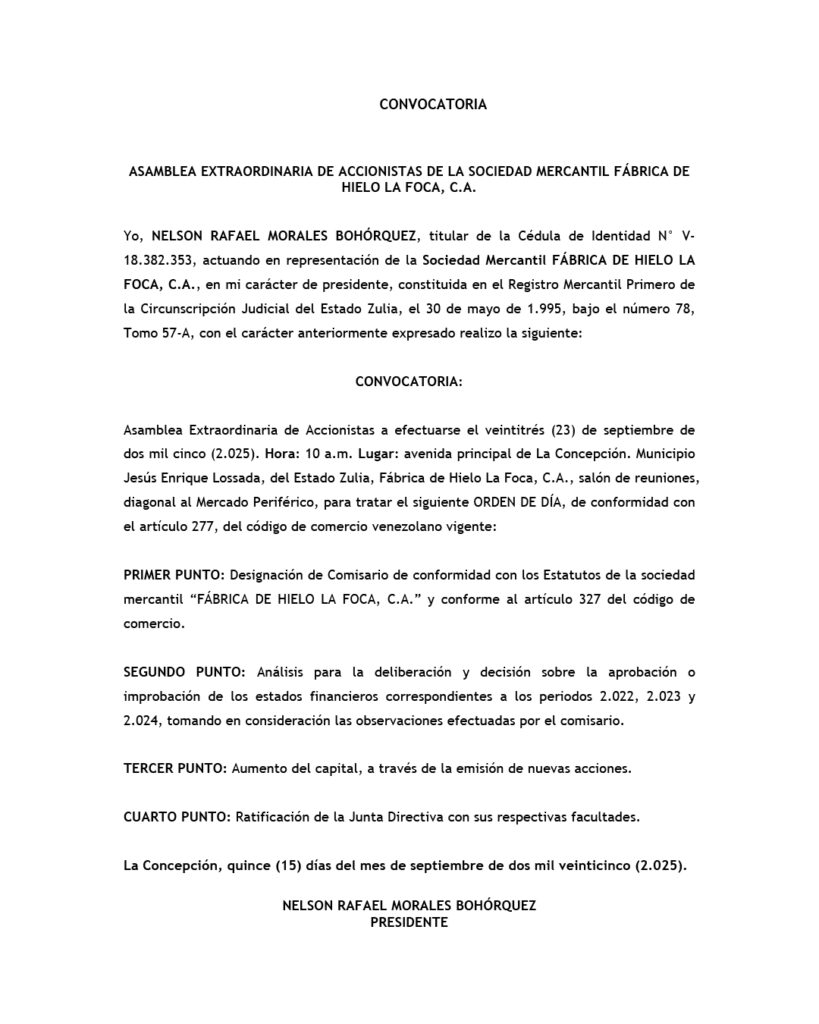 Convocatoria Asamblea Extraordinaria de Accionistas Sociedad Mercantil Fabrica de Hielo LA FOCA CA
