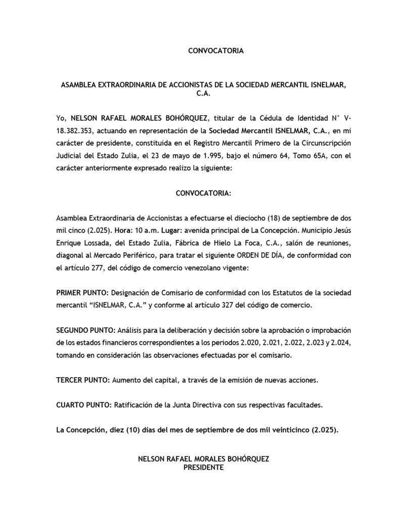 Convocatoria Asamblea Extraordinaria de Accionistas Sociedad Mercantil ISNELMAR CA