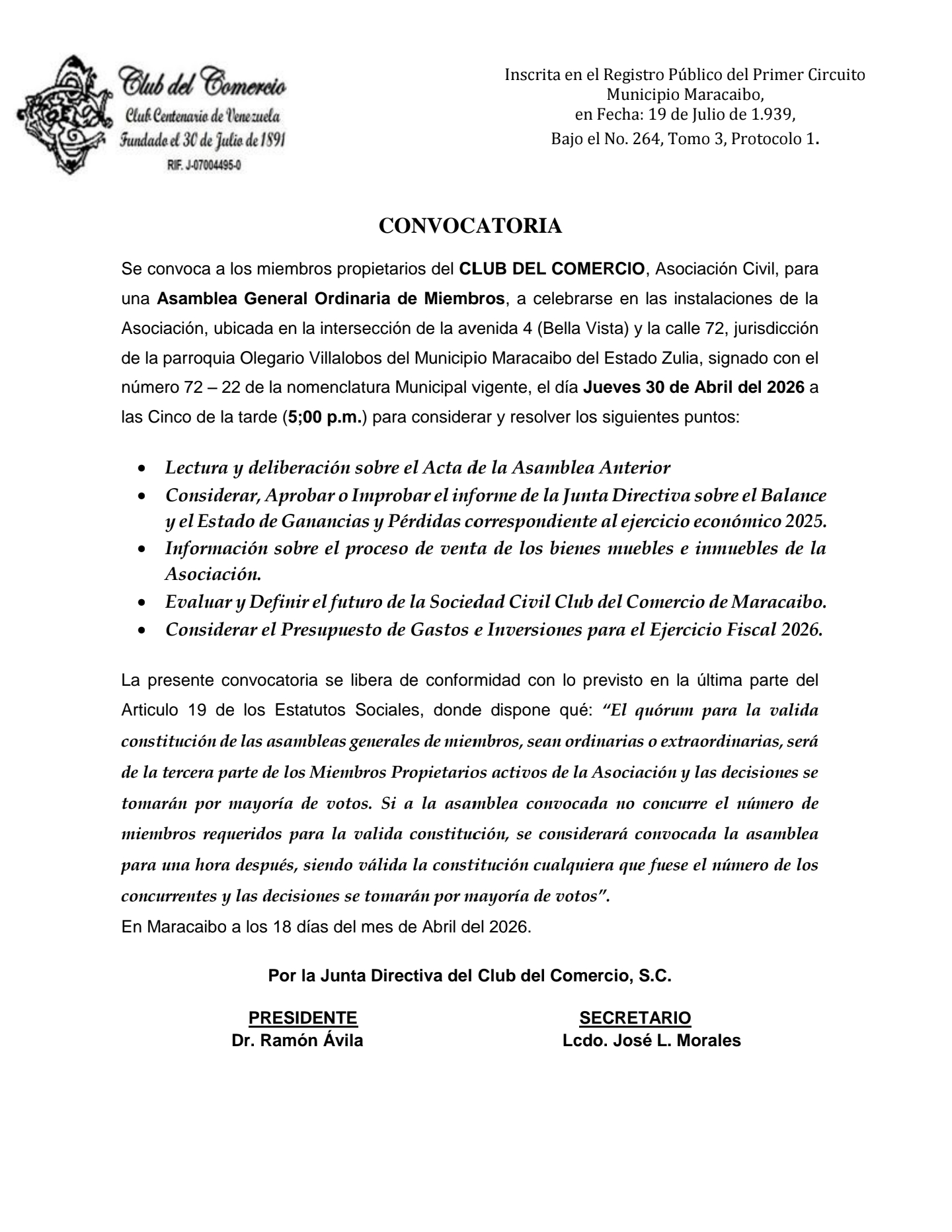 Convocatoria Asamblea Ordinaria de Miembros Club del Comercio