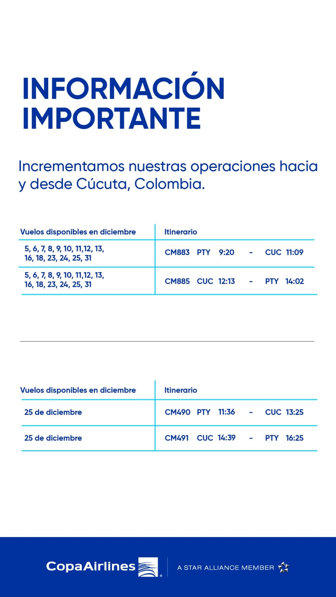 Adicionalmente, "Copa Airlines continúa reforzando sus frecuencias de vuelos entre Panamá y la ciudad de Cúcuta, Colombia, fronteriza con el estado de Táchira en Venezuela", todo esto con el fin de "brindar opciones adicionales a nuestros pasajeros ante la importancia de los viajes en esta época del año".
