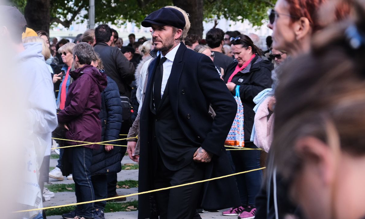 El legendario futbolista inglés David Beckham fue captado en la fila para ver a la reina en Londres.
