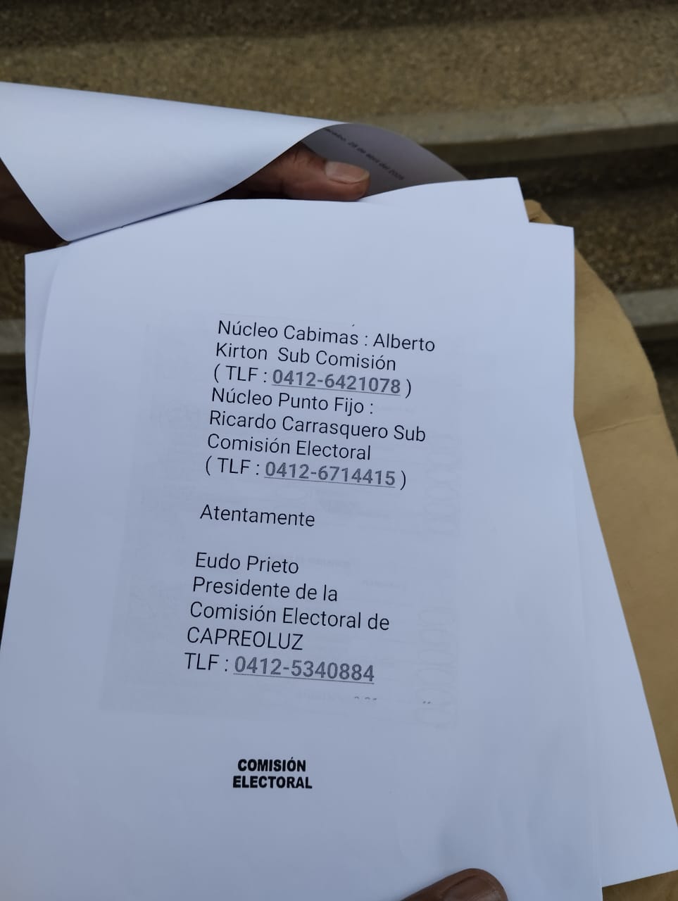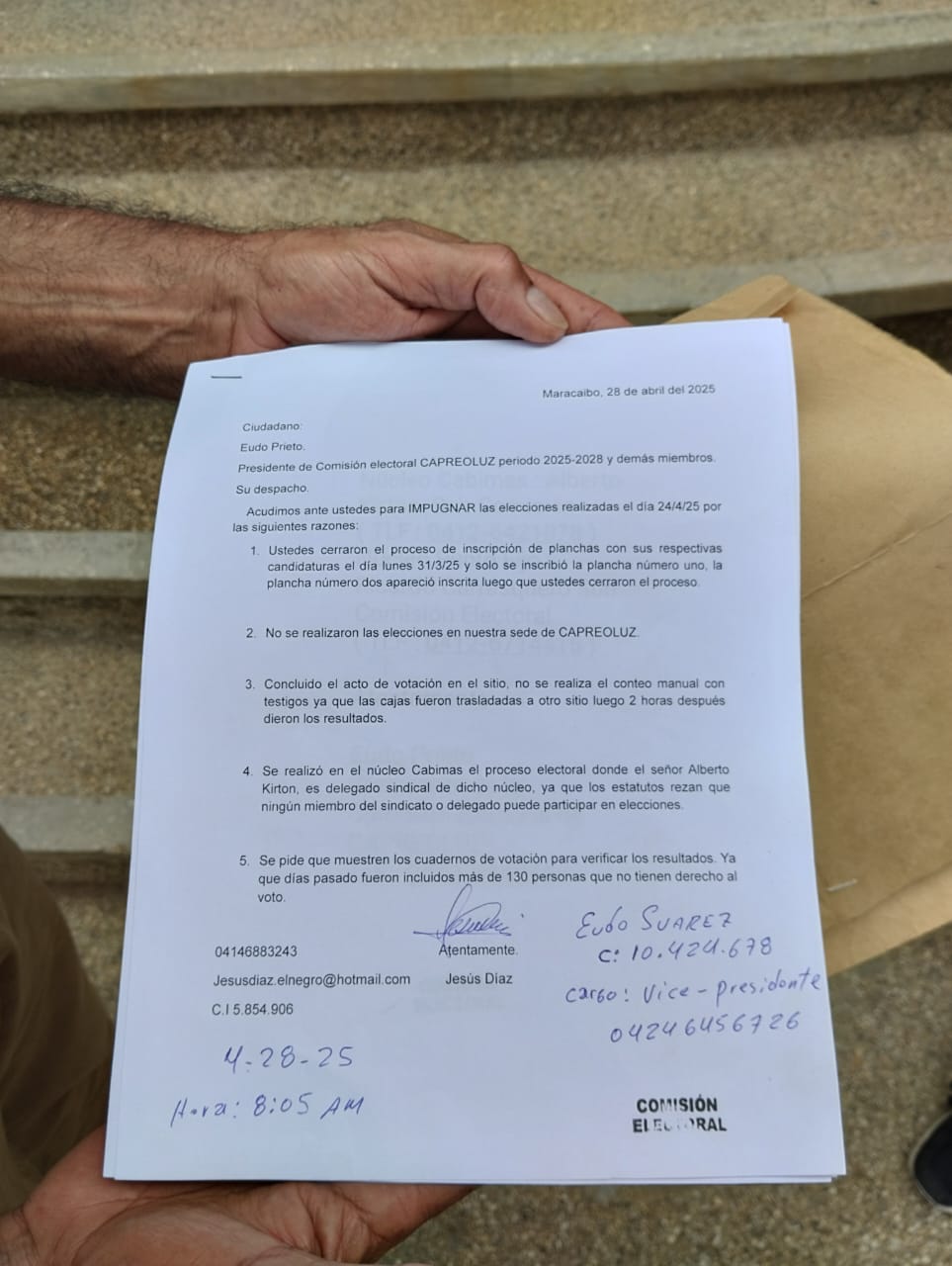 Otra de las irregularidades se dio en el núcleo de Cabimas, donde un delegado sindical fue también candidato a puestos directivos, a pesar que las leyes de Capreoluz lo impiden, señala el texto.