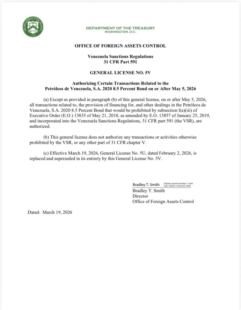Se trata de la licencia general N° 5V que autoriza ciertas transacciones relacionadas con el bono de Petróleos de Venezuela 2020 al 8.5 % a partir del 5 de mayo de 2026.