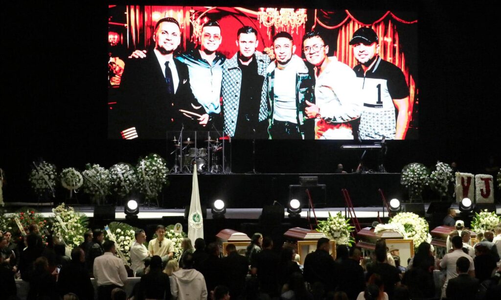 En la primera línea, alineados frente al público y al escenario estaban los féretros con la foto de Jiménez y de las otras cinco personas que murieron en el accidente, cubiertos de arreglos florales y custodiados por familiares, allegados y personal de logística.
