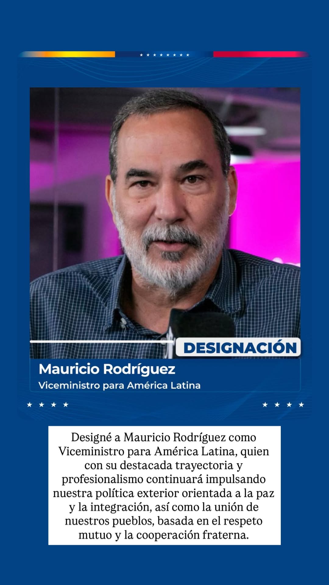 Rodríguez consideró que “con su destacada trayectoria y profesionalismo continuará impulsando nuestra política exterior orientada a la paz y la integración, así como la unión de nuestros pueblos, basada en el respeto mutuo y la cooperación fraterna”.