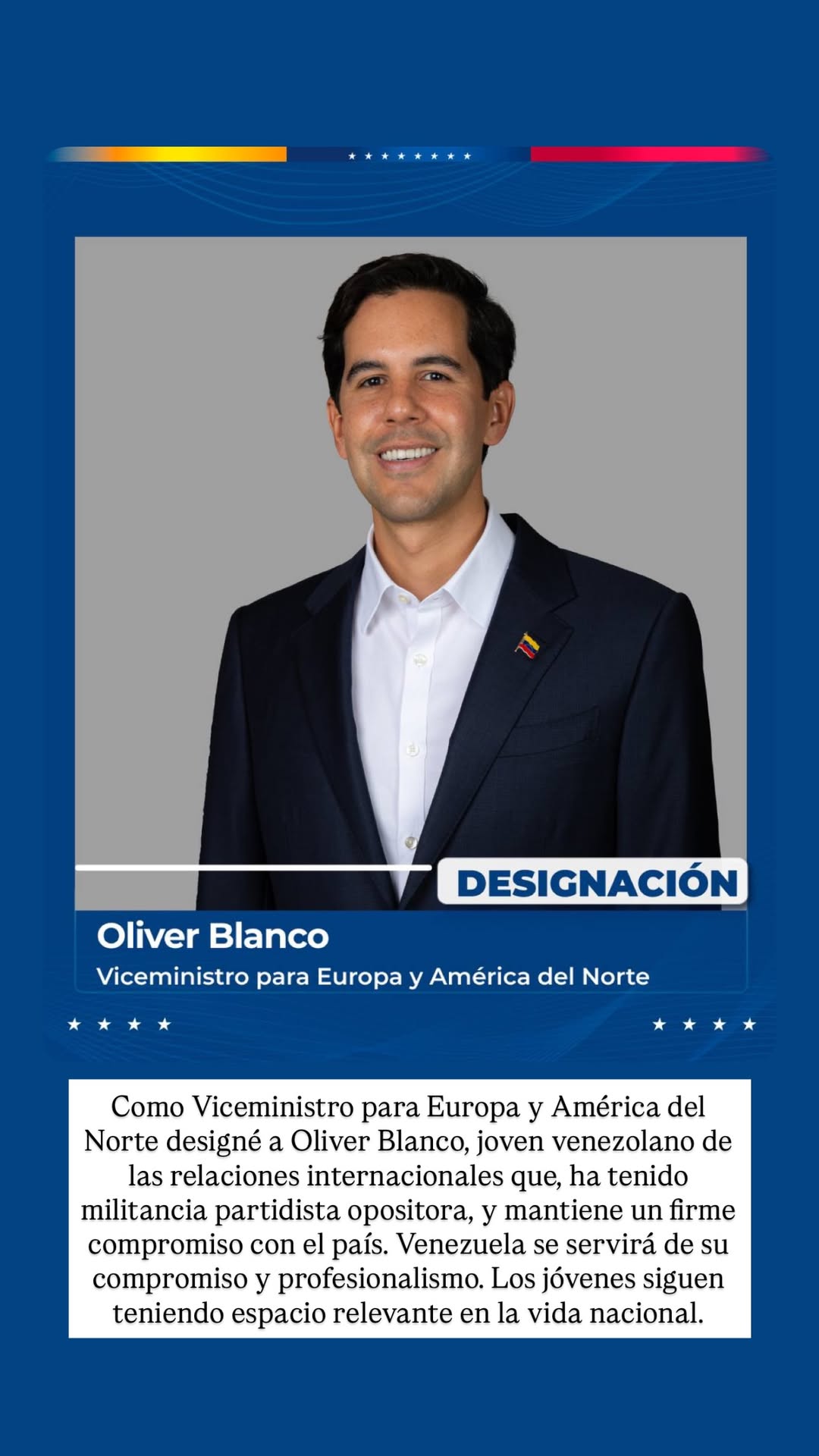 La líder chavista lo describió como un “joven venezolano de las relaciones internacionales que, ha tenido militancia partidista opositora, y mantiene un firme compromiso con el país. Venezuela se servirá de su compromiso y profesionalismo. Los jóvenes siguen teniendo espacio relevante en la vida nacional.