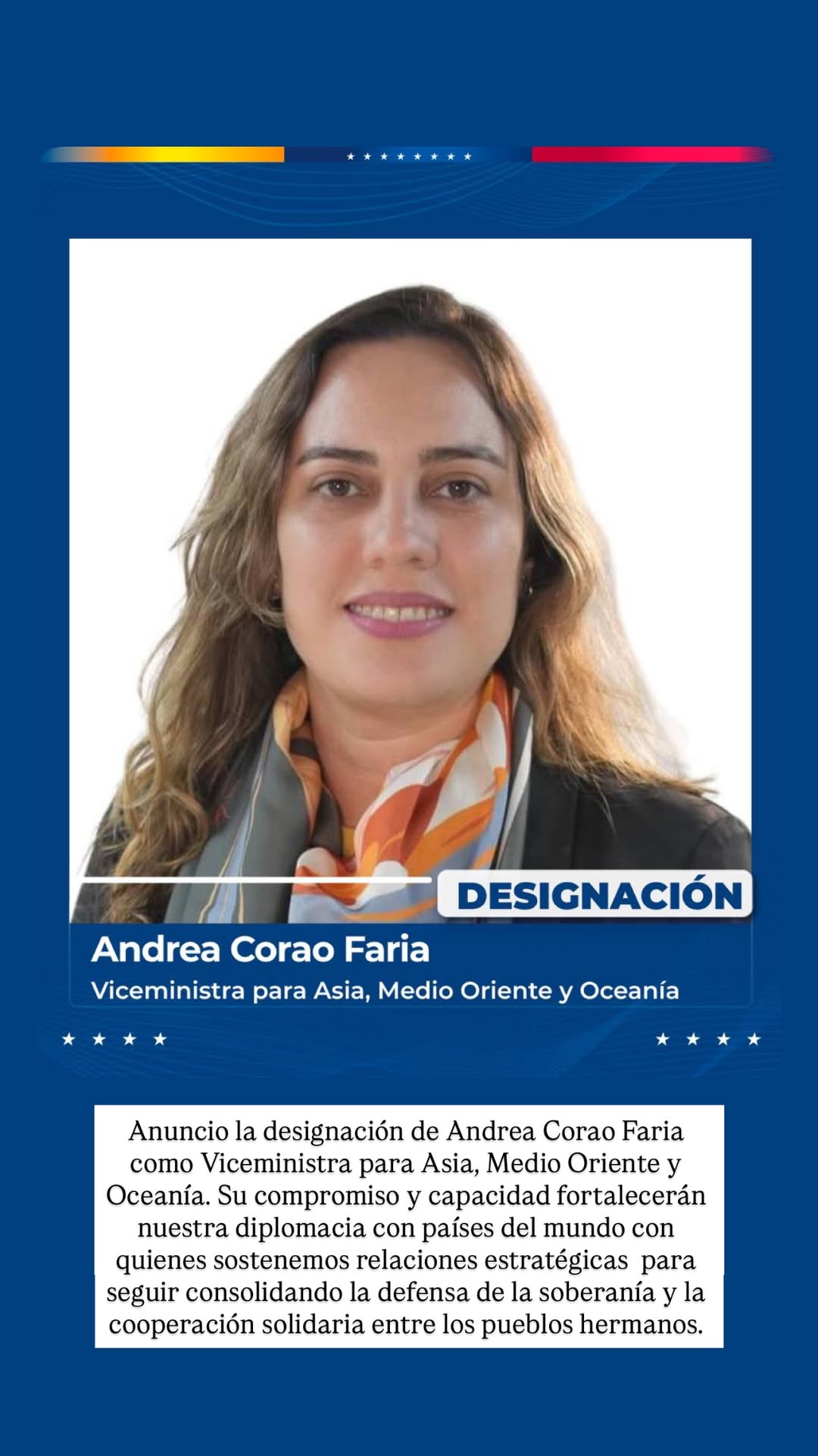 Por otro lado, Andrea Corao Faria fungirá como viceministra para Asia, Medio Oriente y Oceanía, en sustitución de Tatiana Pugh.