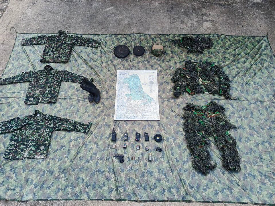 Indicó que en el campamento se encontró una carpa camuflada, un traje “guily”, tres uniformes colombianos, un casco táctico, botas plásticas, cuatro radios, dos cargadores de radio, baterías, un mapa, granadas, pistolas, municiones y cintas para fabricar correajes.