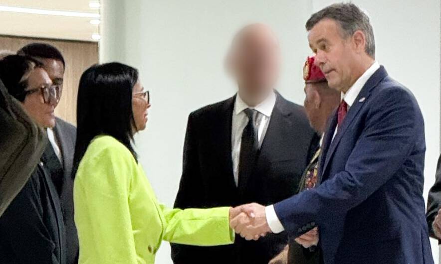 En la foto se observa a la “mandataria interina” tomándose de la mano con Ratcliffe, funcionario estadounidense de mayor rango y el primer miembro del gabinete en viajar al país desde la captura de Nicolás Maduro en la operación militar del pasado sábado 3.