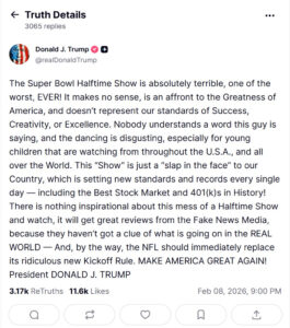 “¡El espectáculo del medio tiempo del Super Bowl es absolutamente terrible, uno de los peores de la historia!”, dijo el presidente en la red social Truth Social.