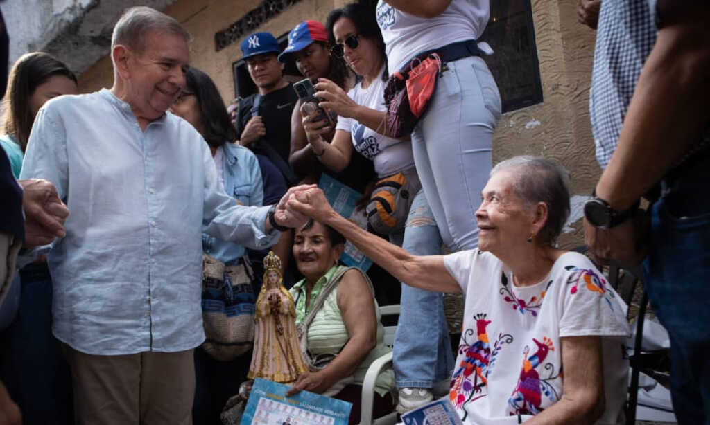 El candidato de la Plataforma Unitaria Edmundo González Urrutia fue recibido este viernes 7 de junio con gran entusiasmo por vecinos que ya lo llamaban "presidente" a la entrada del barrio, en el bulevar María Pérez de Díaz.