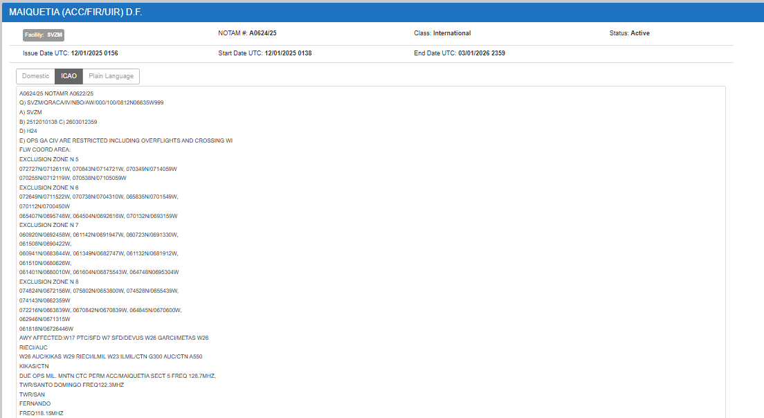 El gobierno estadounidense expuso una “prohibición de vuelo de seguridad” con el número A0002/26 en la Región de Información de Vuelo (FIR, en inglés) de Maiquetía, cuyas siglas son SVZM, y que cubre todo el espacio aéreo nacional.