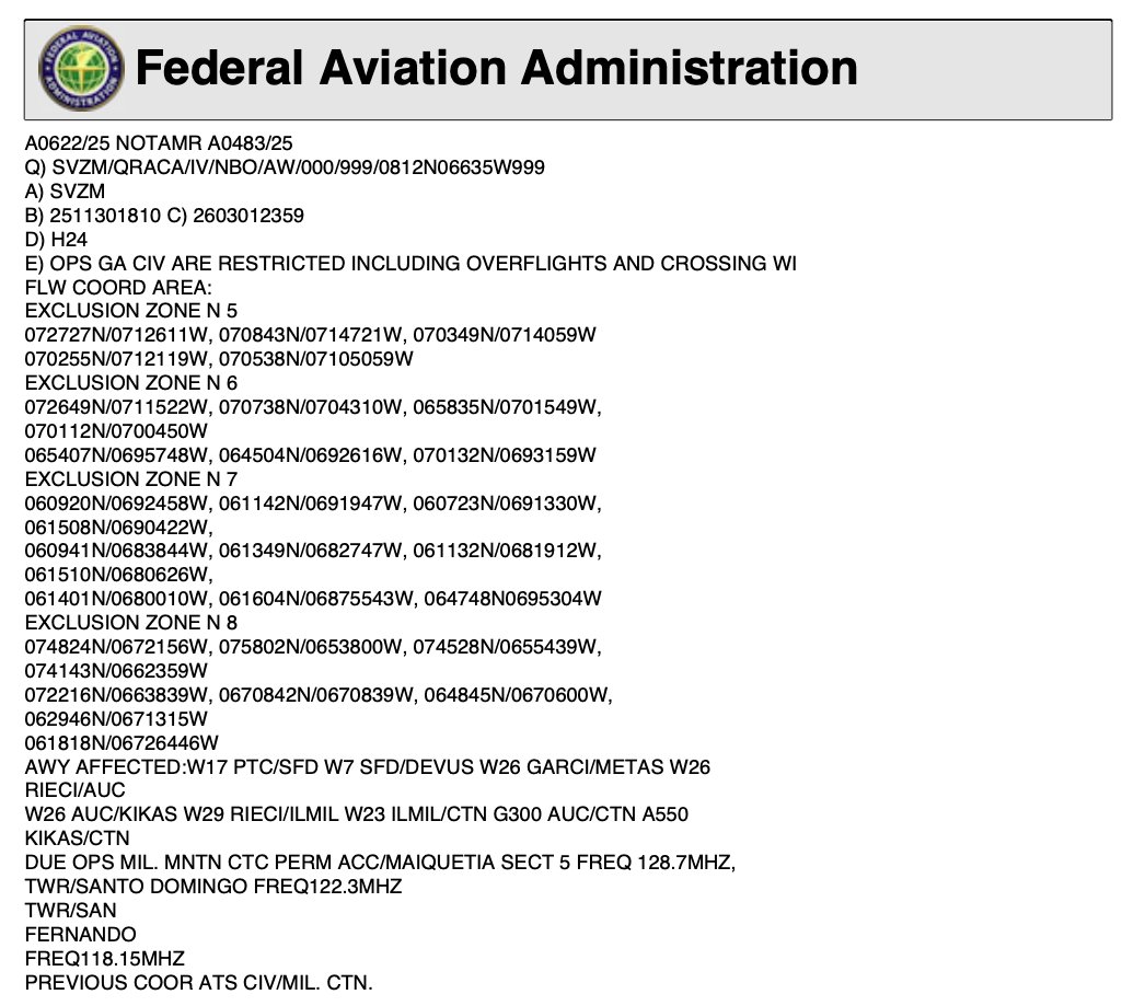 La Administración Federal de Aviación (FAA) emitió este domingo 30 de noviembre un nuevo NOTAM (Notice to Air Missions, en inglés) en el que impuso “restricciones” a “todas las operaciones de aviación” en varios sectores del sur de Venezuela, principalmente en la frontera, al alegar “presencia de operaciones militares en la zona”.