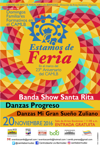 El Centro de Arte de Maracaibo Lía Bermúdez (CAMLB) invita este 20 de noviembre a disfrutar de su programa especial Estamos de Feria, que contará con la presentación de Banda Show Santa Rita, acompañado de Danzas Progreso y la Fundación Danzas mi Gran Sueño Zuliano.