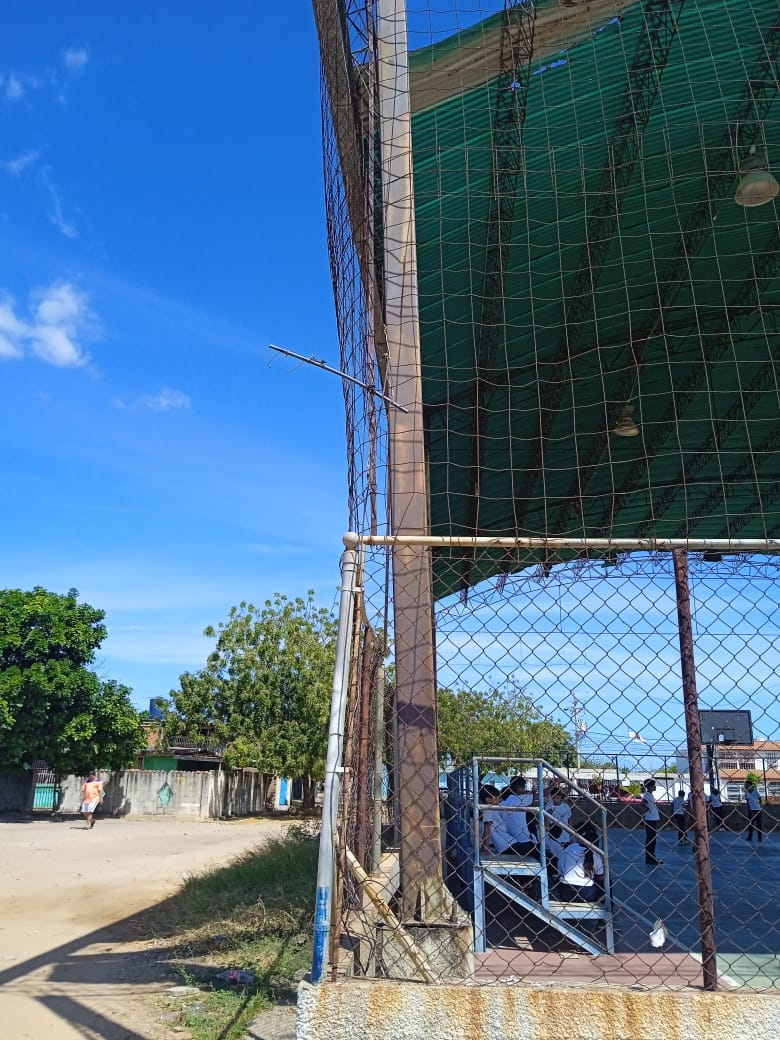 El comunicador social expuso que en la cancha del sector 10 se puede observar todo “el armazón de cabillas” de un borde en el techo debido a que se han ido despegando las láminas de zinc que lo recubren.