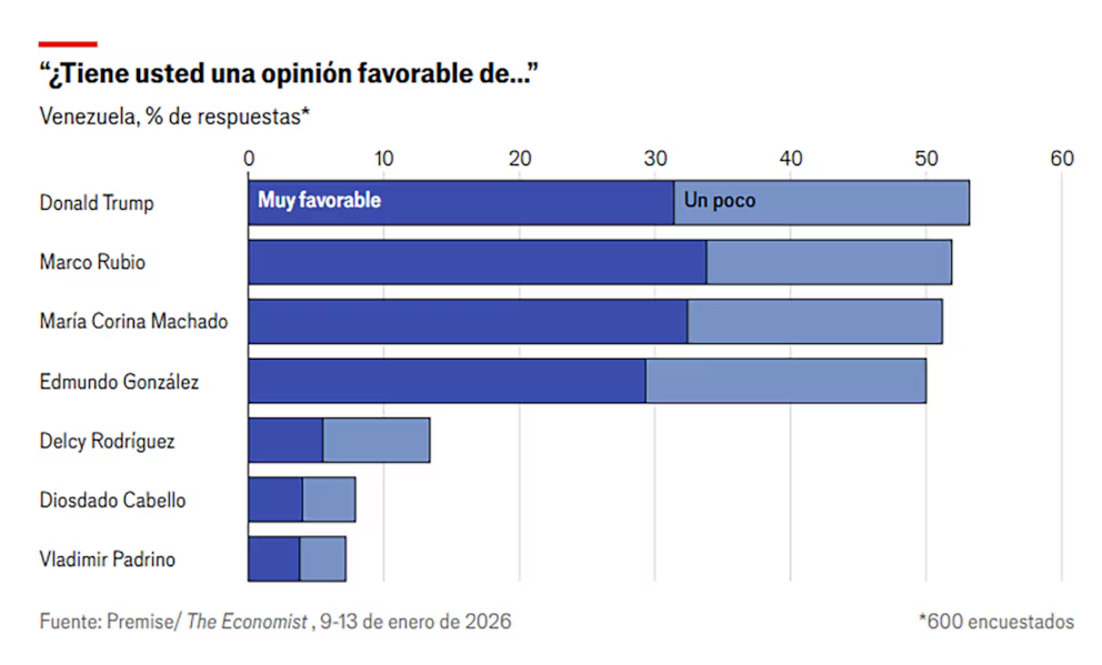 En cuanto a la “favorabilidad externa”, el presidente de los Estados Unidos, Donald Trump, obtuvo un 53 % de aprobación, mientras que el secretario de Estado, Marco Rubio, alcanzó un 51 %, cifras superiores a las de “cualquier político venezolano”.