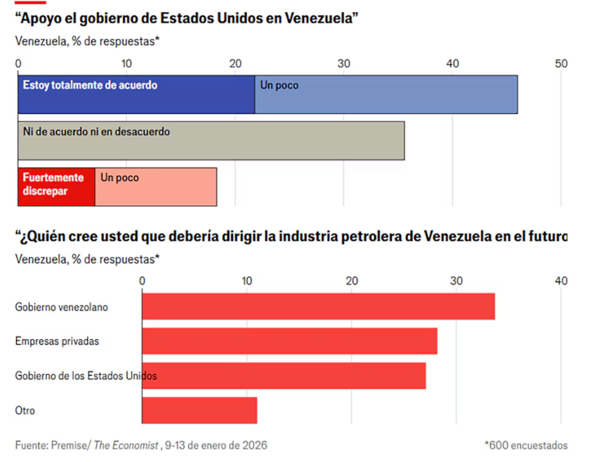 El control de los recursos generó más divisiones: un 33 % considera que Venezuela debe mantener soberanía plena sobre su petróleo, mientras que un 26 % está de acuerdo con que Estados Unidos administre una Petróleos de Venezuela Sociedad Anónima (Pdvsa) totalmente privatizada.