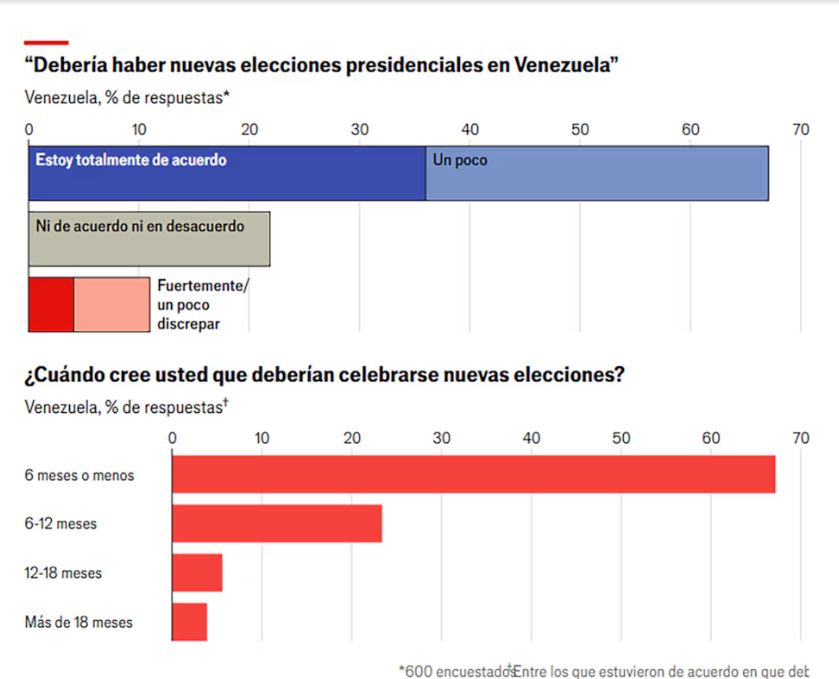 En ese sentido, el 66 % exigió nuevas elecciones presidenciales “con urgencia”, mientras que el 70 % pidió que se realicen “en menos de 6 meses”.