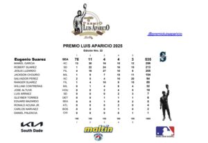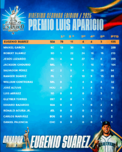 El antesalista venezolano Eugenio Suárez se impuso en la edición 22 del Premio Luis Aparicio, presentado por Maltín Polar, siendo reconocido como el mejor jugador venezolano de la temporada 2025.