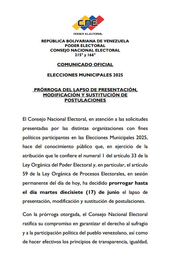 El organismo reseñó que con la prórroga otorgada el CNE “ratifica su compromiso de garantizar el derecho al sufragio y a la participación política del pueblo venezolano”.
