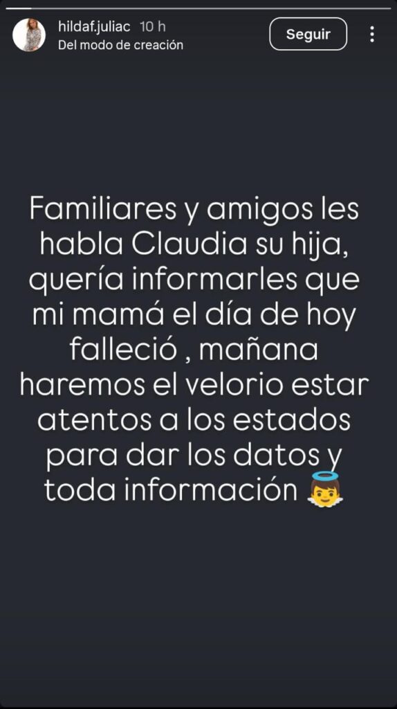 “Familiares y amigos, les habla Claudia, su hija. Quería informarles que mi mamá el día de hoy falleció; mañana haremos el velorio; estar atentos a los estados para dar los datos y toda información”, reveló la hija a través de una historia en la cuenta de Instagram de su madre.