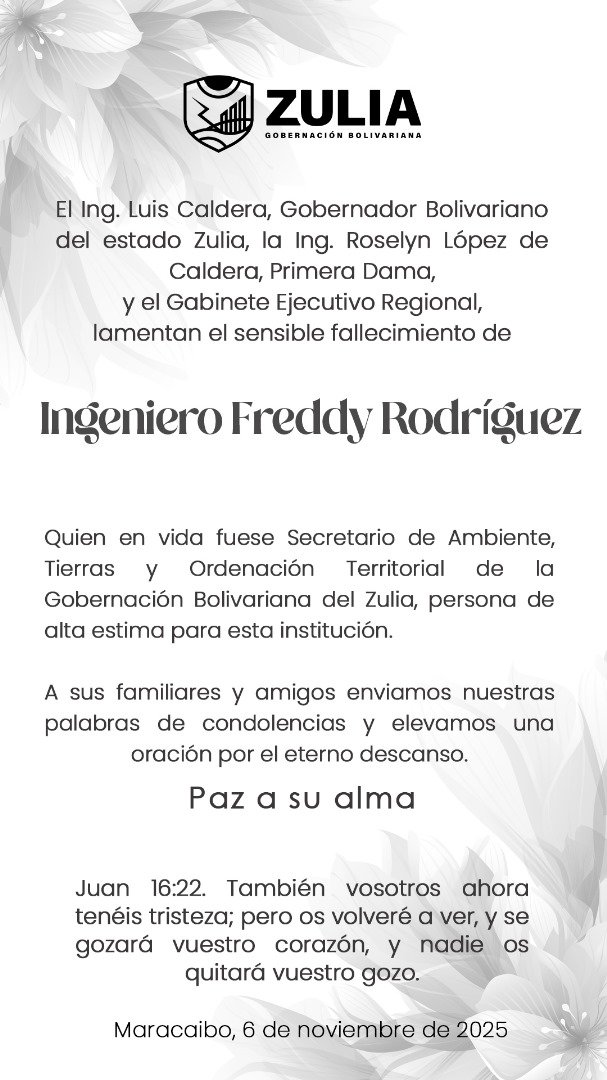 El ingeniero Freddy Rodríguez, quien se desempeñaba como secretario de Ambiente, Tierras y Ordenación Territorial de la Gobernación del Zulia, falleció la mañana de este jueves 6 de noviembre.