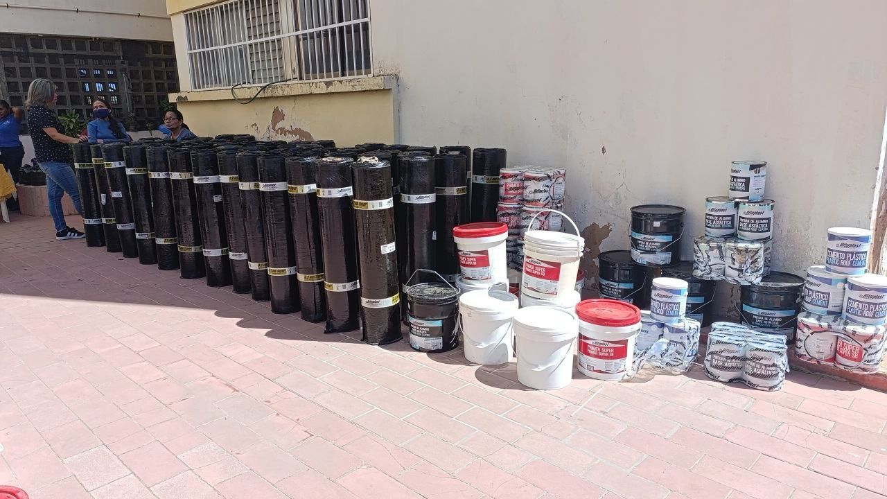 Los residentes de 17 edificios de los Pinos Real, Cembro, Nigral y Caribeño recibieron más de 700 rollos de manto asfáltico, más de 200 cuñetes de primer, más de 270 cuñetes de pintura aluminizada y más de 250 cuñetes de cemento plástico, como parte de la primera fase del Plan de Respuesta Inmediata que se llevará a cabo en dicho complejo habitacional.