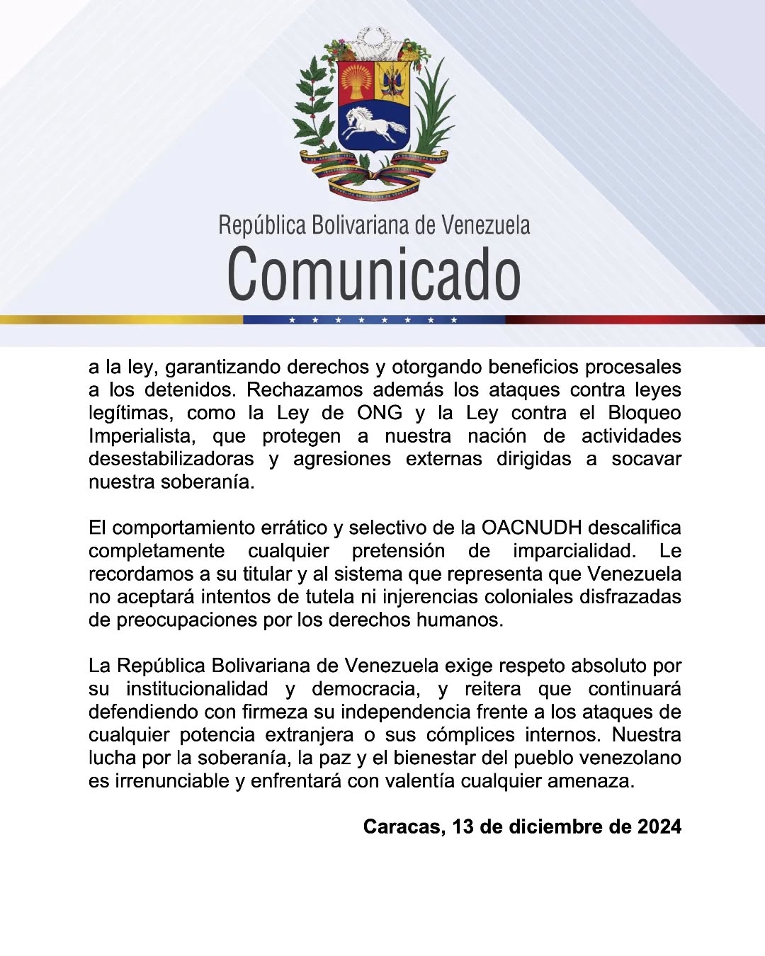 Asimismo, reitera que “Venezuela es un Estado soberano y garante de los derechos humanos”, además de rechazar “los ataques contra leyes legítimas, como la Ley de oenegé y la Ley contra el Bloqueo Imperialista, que protegen la soberanía y la paz del pueblo venezolano”.