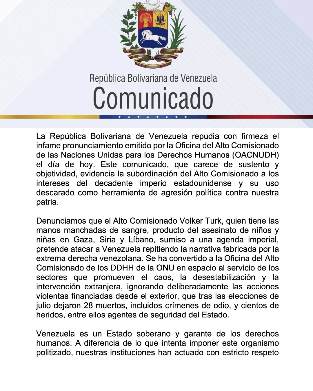 En este sentido, Venezuela denuncia “que el Alto Comisionado Volker Turk, quien tiene las manos manchadas de sangre, producto del asesinato de niños y niñas en Gaza, Siria y Líbano, sumiso a una agenda imperial, pretende atacar a Venezuela repitiendo la narrativa fabricada por la extrema derecha venezolana”.